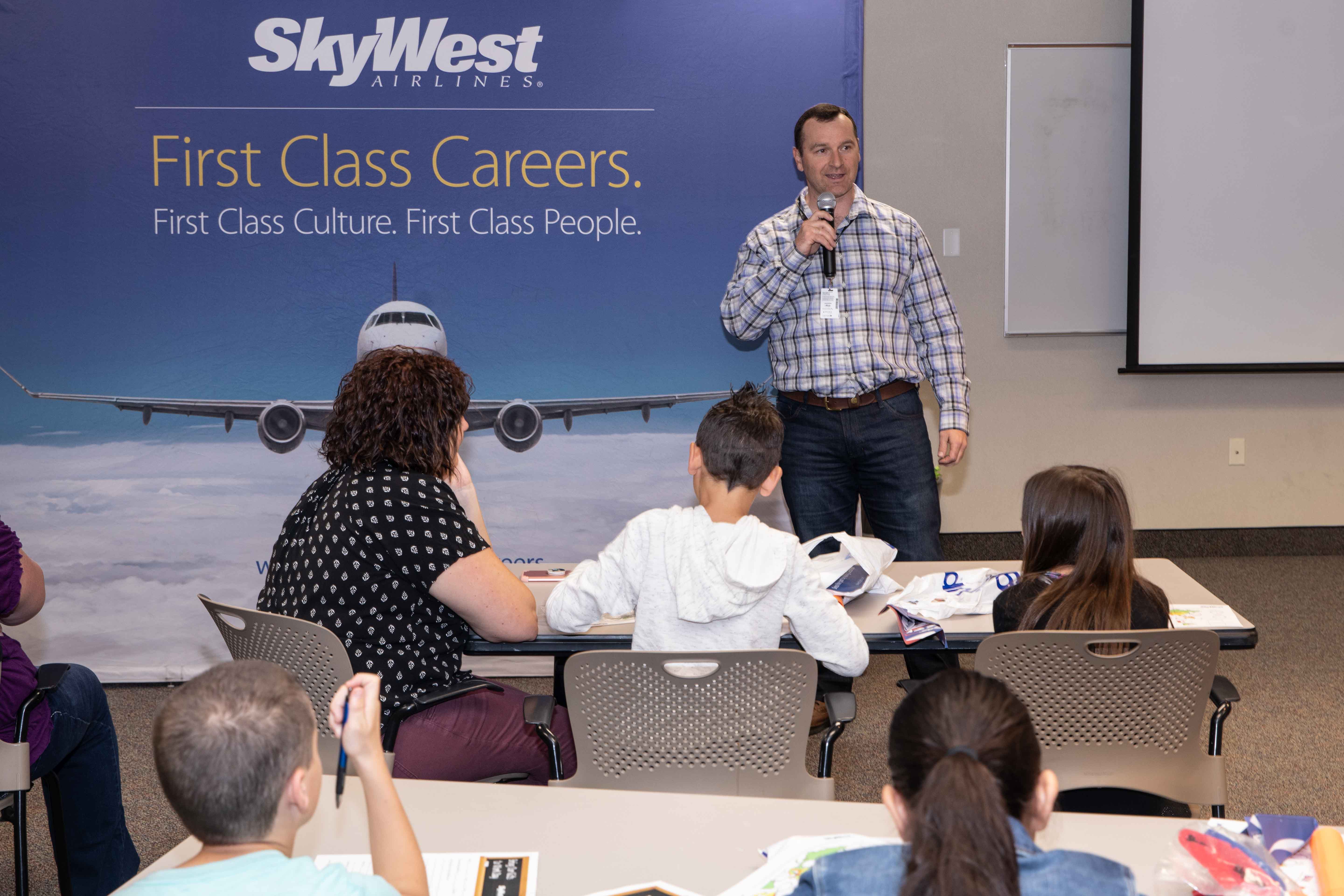 “Your parents make sure that 30 million people every year get safely to their destination. And I’m very appreciative of your parents, who come to work every single day to take of the people at SkyWest, and to take care of you,” said Mike. “Because that really is their number one job, is to take care of each one of you guys.”